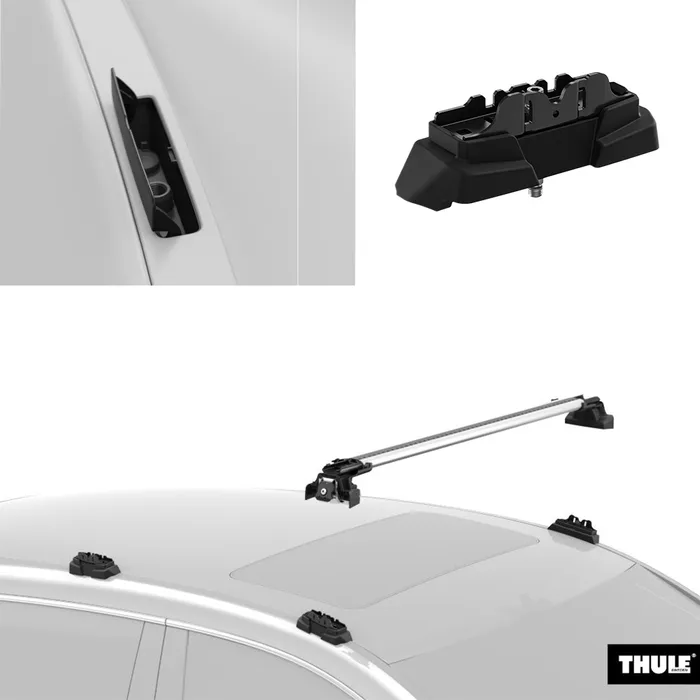 Es gibt weitere Arten der Vorrichtungen für die Anbringung von Dachträgern auf die wir eingehen. Die gängigsten sind Fixpunkte (oben rechts, Thule Bezeichnung: Fixpoint) oder eine bündige Dachreling (unten links, Flush Rail). Hat das Auto keine Vorrichtung (unten rechts), kommen sogenannte Klemmträger zum Einsatz.