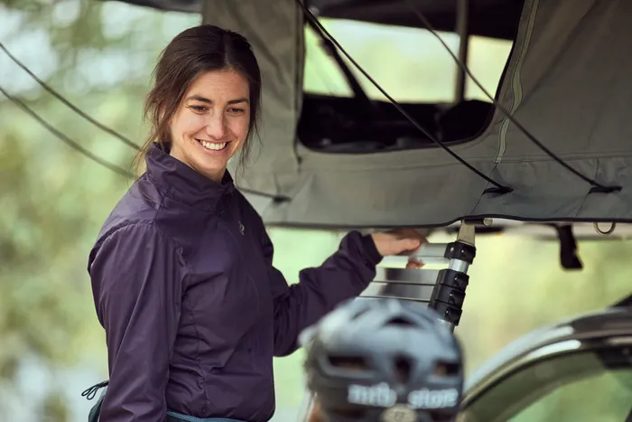 Im zusammengeklappten Zustand ist die Zeltkonstruktion mit niedrigem Profil nur 24 cm höher als der Dachträger und sorgt somit für eine gute Aerodynamik. Um es aufzustellen, wird das Zelt einfach aufgeklappt und die Teleskopstangen ausgefahren.